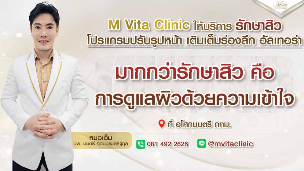 M Vita Clinic เป็นคลินิกรักษาสิว ที่วางแผนการรักษาอย่างใกล้ชิดโดย หมอเอ็ม นพ.มนตรี อุดมประเสริฐกุล ที่สั่งสมประสบการณ์ด้านความงาม 15 ปี ดูแลทุกปัญหาสิว รวมถึงรอยสิว และหลุมสิว