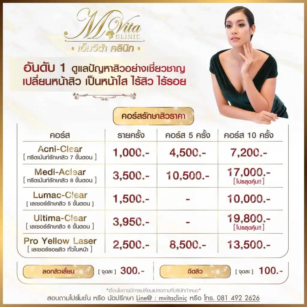 การรักษาสิวที่ M Vita Clinic รายครั้งเริ่มต้นราคาประมาณ 1,000 บาท ขึ้นอยู่กับปัญหาผิวและความรุนแรงของสิว โดยแพทย์จะประเมินและแนะนำโปรแกรมการรักษาที่เหมาะสมที่สุดเฉพาะบุคคล