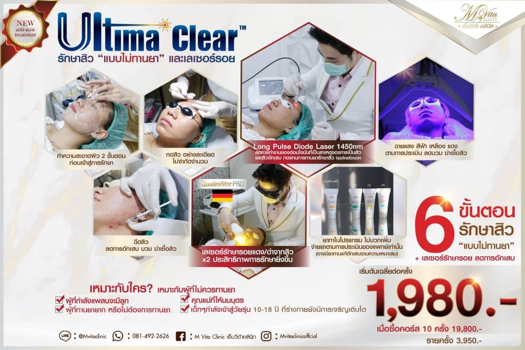 โปรแกรมอัลติแมคเคลียร์ รักษาสิวและรอยสิว แบบไม่ทานยา ตัวท็อปของคลินิก ที่ช่วยลดการอักเสบ เคลียร์รอยดำ รอยแดง และฟื้นฟูผิวให้แข็งแรง โดยใช้เลเซอร์ Long Pulse Diode Laser 1450nm ซึ่งเป็นการรักษาที่จะตัดต้นต่อการเกิดสิวโดยตรง ร่วมกับเลเซอร์รักษารอยสิวครบสูตร ซึ่งเหมาะกับผู้ที่มีปัญหาทั้งสิวและรอยสิว แต่ไม่ชอบทานยา ผู้ที่มีแพลนตั้งครรภ์ น้องวัยรุ่นอายุต่ำว่า 18 ปีครับ