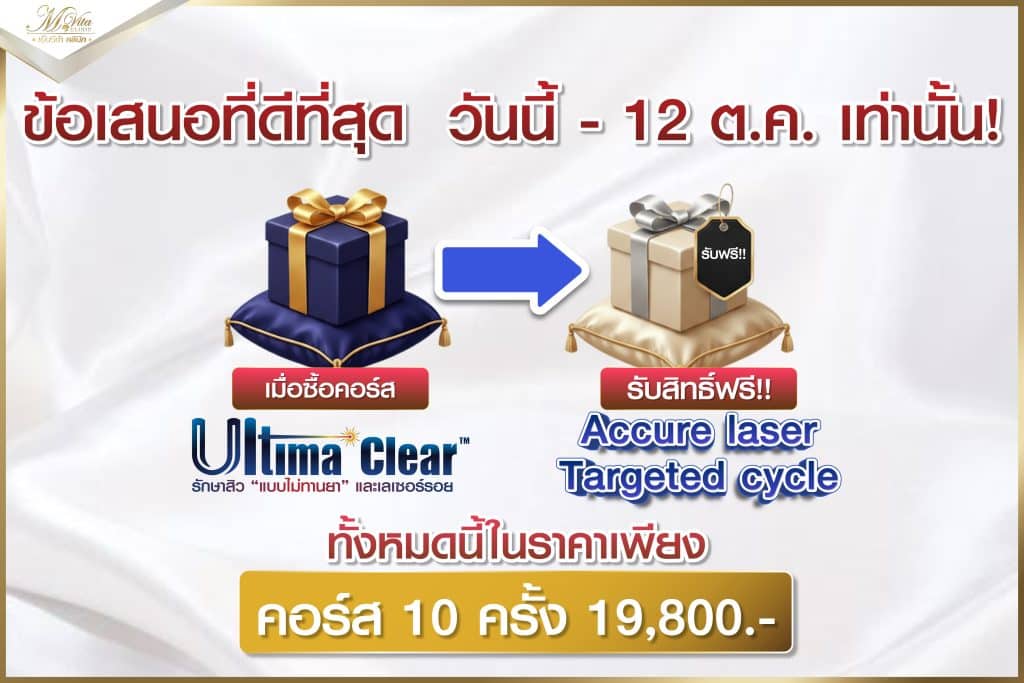 เพียงเปิดคอร์ส UltimaClear 10 ครั้ง ในราคา 19,800 บาท รับสิทธิเข้ารับบริการ Accure Laser (Targeted Cycle) 1 ครั้ง ในช่วงวันที่ 10-12 ต.ค. ฟรี!